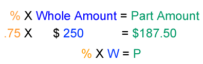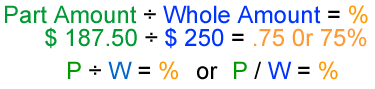 Go back and review parts 1 and 2 if you are uncertain about how to use the formulas. Finally, let's find out who to find the percentage from the whole and part amounts. 3 - Find the % For example: I borrowed $250.00. I have paid back $187.50 of that amount. What percentage have I paid back? What percentage do I still owe? When you have the amount of the whole and of the part, you must change the process to find the percentage they represent. The whole is 100%, of course. What about the other part? Divide the Part by the Whole. The answer is the percentage the Part represents. $187.50 / $ 250.00 = .75 or 75%.