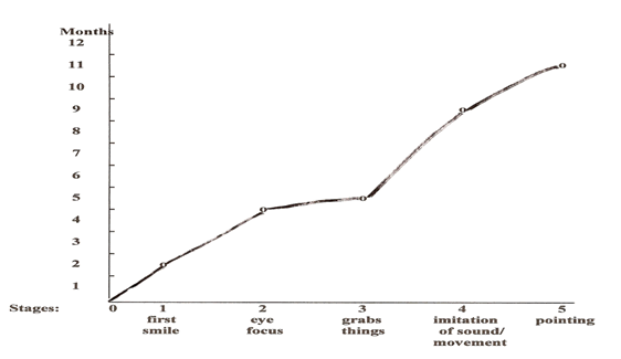 SUPPORT ACTIVITIES IN A graph shows information visually. On a line graph, the vertical line (up and down) will show the child’s age. The horizontal line (side to side) will show the periods (months, years, days) of a child’s development. PROJECT: You will create a chart for a child between birth and 5 years old, for any time period you wish . You may also pick the type of development you want to track. The example below shows a line graph for a child’s first year of life. The milestones or progress points along the bottom line show a child’s progress from simple awareness of his world to becoming involved in it. You could graph a child’s language development, a child’s walking development, or a child’s development of the concept of right and wrong.