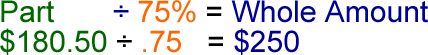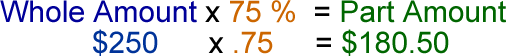 Remember: when you work with percentages, WHOLE = 100% Finding the Part When you calculate amounts with percentages, you must express the percentage as a decimal. For example,