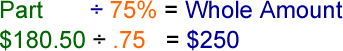 Go back and review parts 1 and 2 if you are uncertain about how to use the formulas. Finally, let's find out who to find the percentage from the whole and part amounts. 3 - Find the % For example: I borrowed $250.00. I have paid back $187.50 of that amount. What percentage have I paid back? What percentage do I still owe? When you have the amount of the whole and of the part, you must change the process to find the percentage they represent. The whole is 100%, of course. What about the other part? Divide the Part by the Whole. The answer is the percentage the Part represents. $187.50 / $ 250.00 = .75 or 75%.